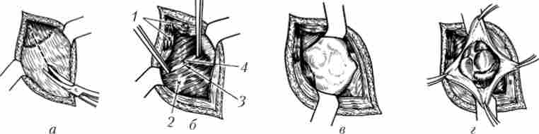 а - розсічені шкіра, підшкірна клітковина і поверхнева фасція, розрізається апоневроз зовнішнього косого м'яза живота; 6 - після розведення клаптів апоневрозу зовнішнього косого м'яза живота двома пінцетами (У) роз'єднуються волокна внутрішнього косого (2), поперечної (3) м'язів живота і поперечної фасції (4); в - краї рани розведені гачками Фарабефа, на дні її видно парієтальних очеревина; г - парієтальних очеревина розсічена, взята в затискачі, в глибині рани видно сліпа кишка і червоподібний відросток