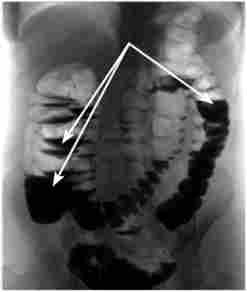 При сумнівних результатах оглядової рентгенографії живота або при проведенні консервативного лікування та динамічного спостереження вдаються до рентгеноконтрастним методам дослідження шлунково-кишкового тракту: оцінці пасажу барієвої суспензії по кишечнику (рис. 23.5) і ирригоскопии. Перший метод здійснюється наступним чином: пацієнтові дають випити 100 мл рідкої барієвої суспензії або вводять її по шлунковому зонду. Оглядовий знімок живота роблять через 4, 6 і 8 год. У здорової людини контрастну речовину досягає товстої кишки через 4-5 год після прийому. Затримка контрастної речовини в тонкій кишці довше цього часу свідчить про наявність непрохідності. Крім цього, контрастну речовину допомагає виявити діаметр і поперечну смугастість (складчастість) тонкої кишки. Іррігоскоіія може бути інформативною тільки при товстокишковій непрохідності. Вона частіше застосовується при плановому обстеженні хворих з підозрою на пухлину товстої кишки.