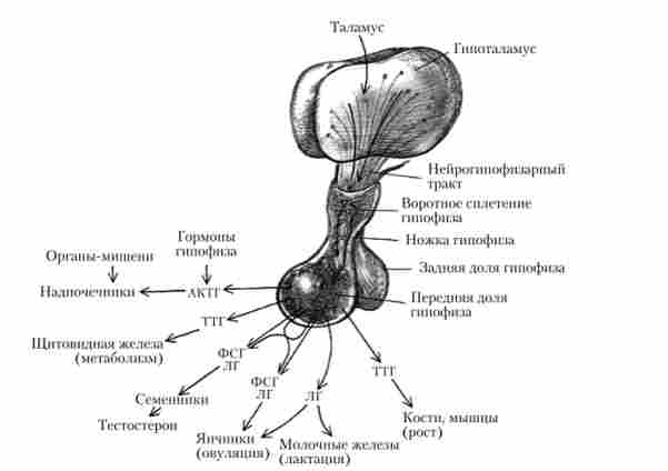 Мал. 3.2.Гіпоталамо-гіпофізарна система і її вплив на органи-мішені