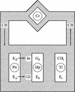 Відповідно до цієї схеми мозок (Сг), підшлункова залоза (Рп), печінку (Нр) та інші тканини (Т1) знаходяться в потоці крові, через який здійснюється гуморальна зв'язок між різними органами. Схема відображає одну зі специфічних особливостей взаємозв'язку метаболічних шляхів в організмі - просторове розділення взаємодіючих компонентів.