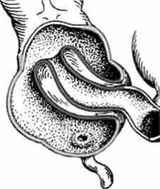 Мал. 233 Змішаний варіант гострої кишкової непрохідності - інвагінація (товсто-тонкокишечная)