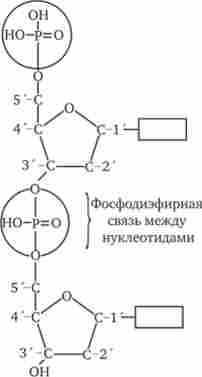 З'єднання нуклеотидів в макромолекулу нуклеїнової кислоти відбувається шляхом взаємодії фосфату одного нуклеотиду з гідроксилом іншого так, що між ними встановлюється фосфодіефірная зв'язок (Рис. 3.2). В результаті утворюється полинуклеотидная ланцюг. Остов ланцюга складається з чергуються молекул фосфату і цукру. До молекулам пентози в положенні С-1 'приєднано одне з перерахованих вище азотистих основ (рис. 3.3).