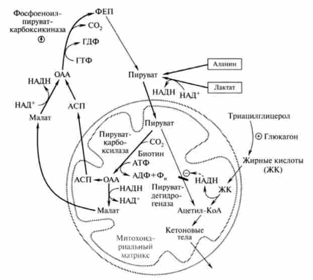 Таким чином, карбоксилирование пірувату в мітохондріях мало лише енергетичне значення, і вуглець С02 (Відзначений зірочкою) в вуглецевий ланцюг продукту реакції не включається. Стехіометричне рівняння реакції: