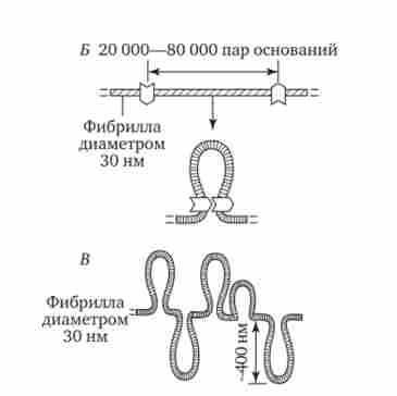 Б - освіту петлі на ділянці хроматіно- виття фібрили; В ?- схема петельной організації ділянки хромосоми