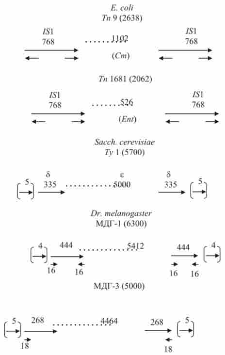 Мал. 9.10. Будова деяких транспозони Е. coli: ТП9 і Тп6' Sacch. cerevisiae: 7> I; D. melanogaster: ПРО-1 і ПРО-3. Цифри - розмір в числі пар нуклеотидів. Стрілки - прямі і інвертовані повтори. Стрілки в дужках - прямий повтор сайту-мішені. Cm - стійкість до хлорамфеніколу; Ent - продукція ентеротоксину; б, е - позначення ділянок ту