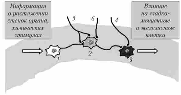 Таким чином, чутливі, вставні і виконавчі нейрони знаходяться за межами ЦНС, безпосередньо в стінах иннервируемого органу. Завдяки цьому багато внутрішні органи навіть після пошкодження симпатичних і парасимпатичних шляхів продовжують здійснювати властиві їм функції. Наприклад, зберігається перистальтична активність кишечника, спостерігаються реакції серця на розтягнення різних його відділів, продовжують скорочуватися лімфатичні судини і т. П.