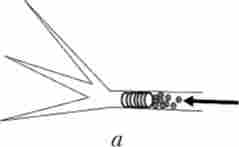 Крім того, всі емболізірующіе матеріали відрізняються за формою і розміром (від 50 мкм до декількох сантиметрів). Великі емболізати (металеві спіралі, окклюдером) використовують для проксимальної оклюзії або закриття патологічних соустий (артеріовенозні соустя, пороки розвитку серцево-судинної системи) (див. Рис. 29.1, г, і Мал. 29.6, а). Дрібні частинки використовують для дистальної оклюзії. При цьому чим менше розмір частки, тим дрібніше калібр окклюзіруемого судини (див. Рис. 29.1, д; Мал. 29.6, б).